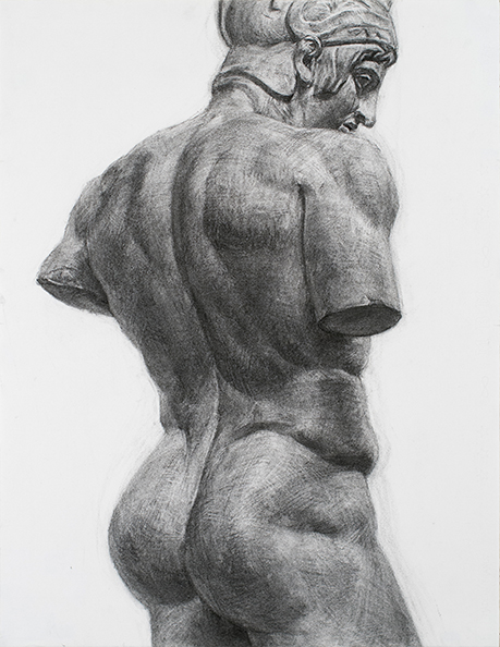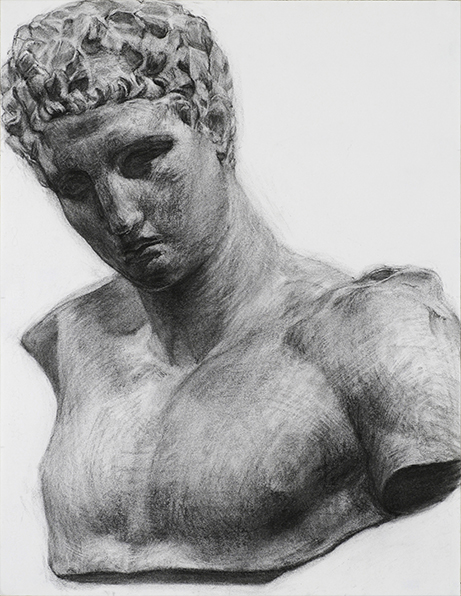 明快で遠目の印象に優れたデッサンです。ヘルメス自体が持つ複雑な構成をゆったりと捉えながら、描写においては観念ではなく観察が重視されている点が魅力です。迫力ある構図を取りながら、白から黒の発色が良く新鮮な印象を描けており、作者の目の良さや安定した造形力を感じさせます。 |
